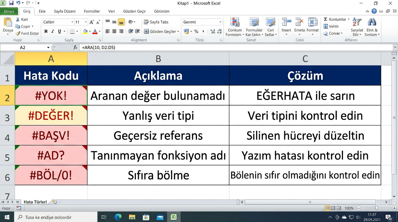 - 💡Hata alıyorsanız: (1) Aranan değerin veri tipini kontrol edin (metin mi sayı mı?), (2) Tablo aralığında aranan sütun gerçekten ilk sütun mu?