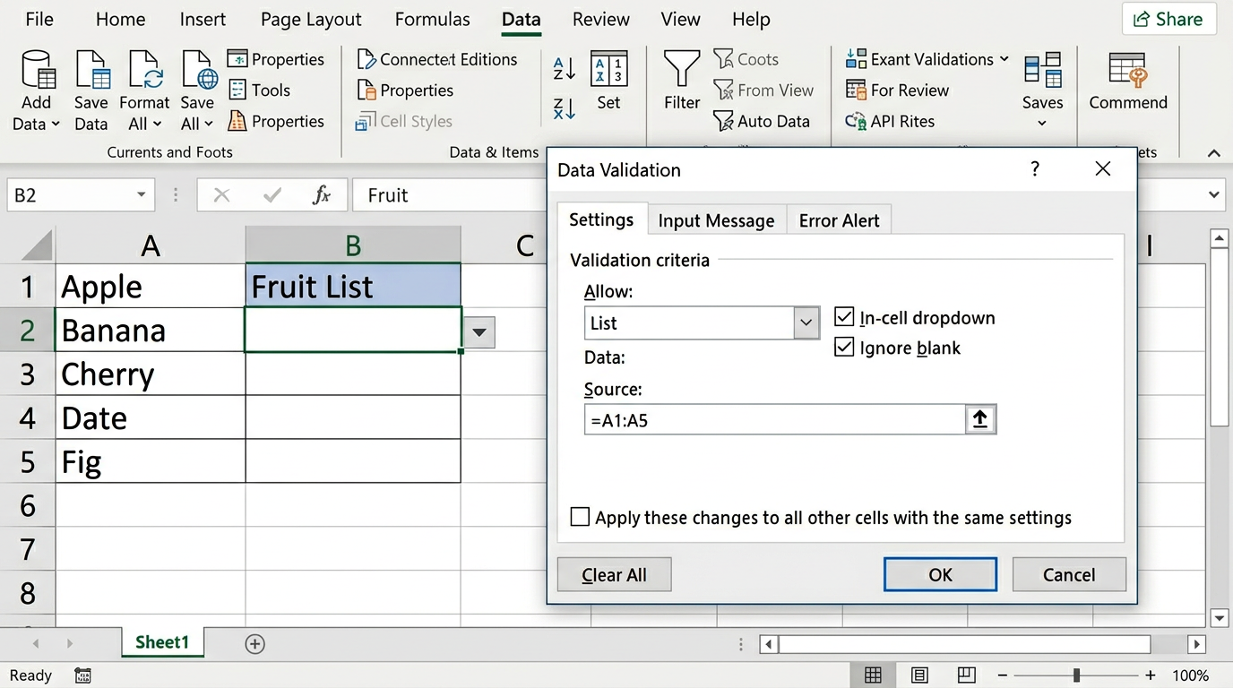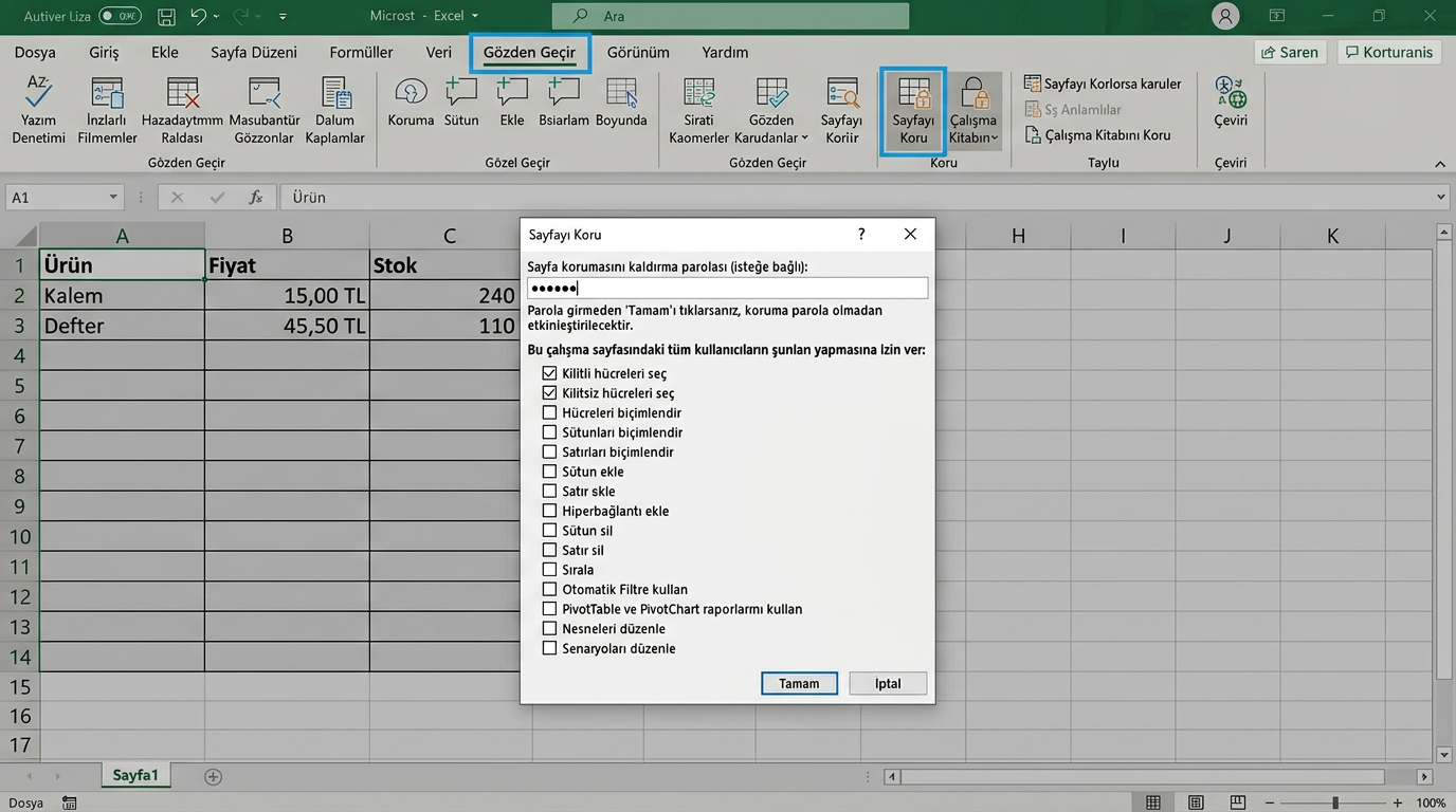 - Veri Doğrulama (Açılır Liste): Hücreyi seçin → Veri → Veri Doğrulama → İzin Ver: Liste → Kaynak: seçeneklerinizi girin.