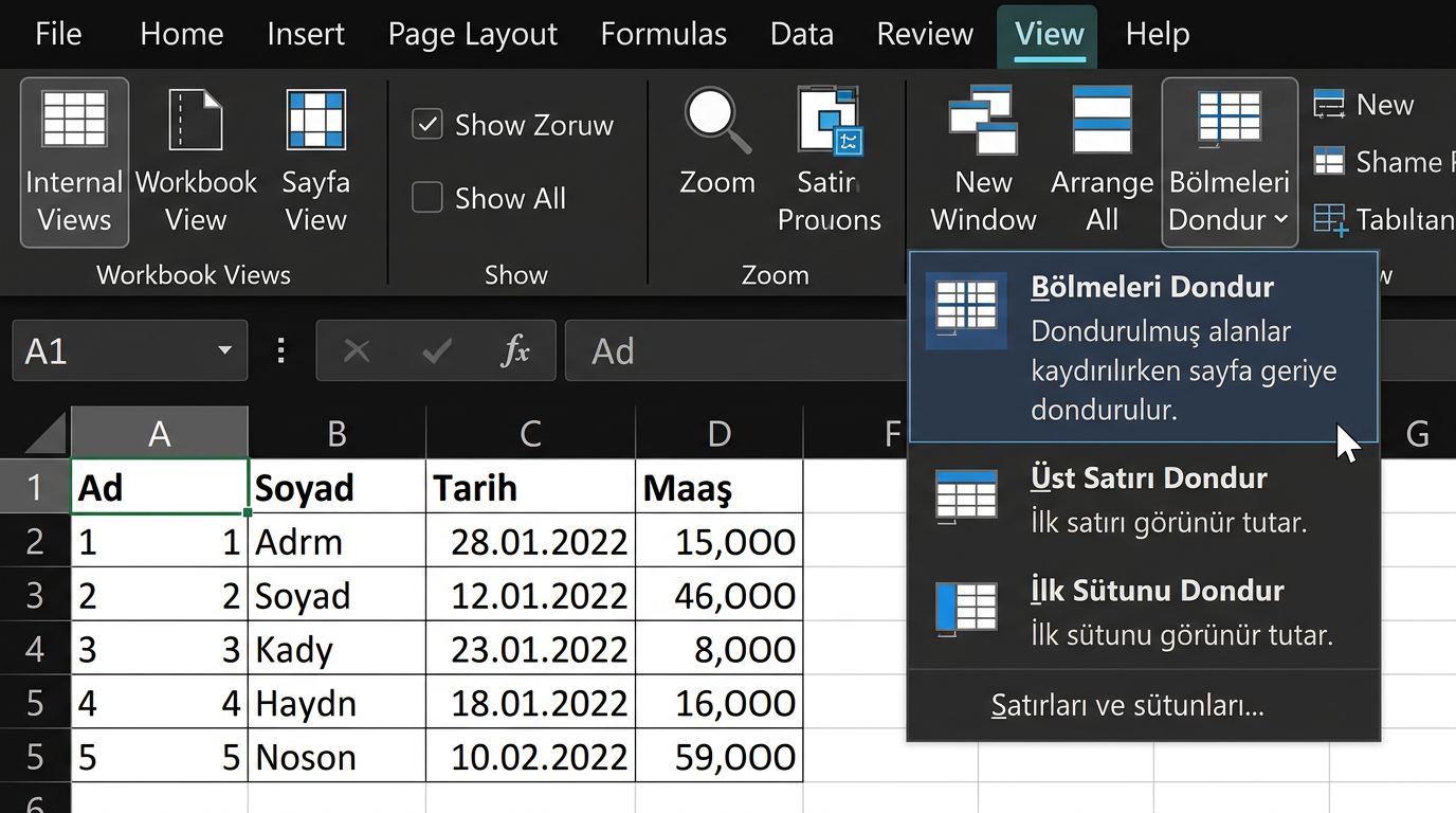 - Sadece üst satırı dondurmak: Görünüm → Bölmeleri Dondur → Üst Satırı Dondur.