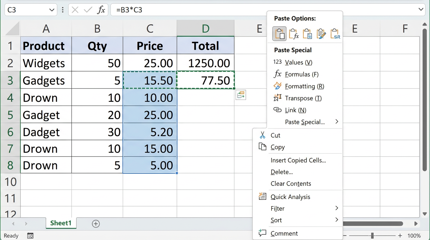 - 💡Birden fazla hücre seçtiğinizde durum çubuğunda anlık toplam ve ortalama görürsünüz — formül yazmadan hızlı kontrol için mükemmel.