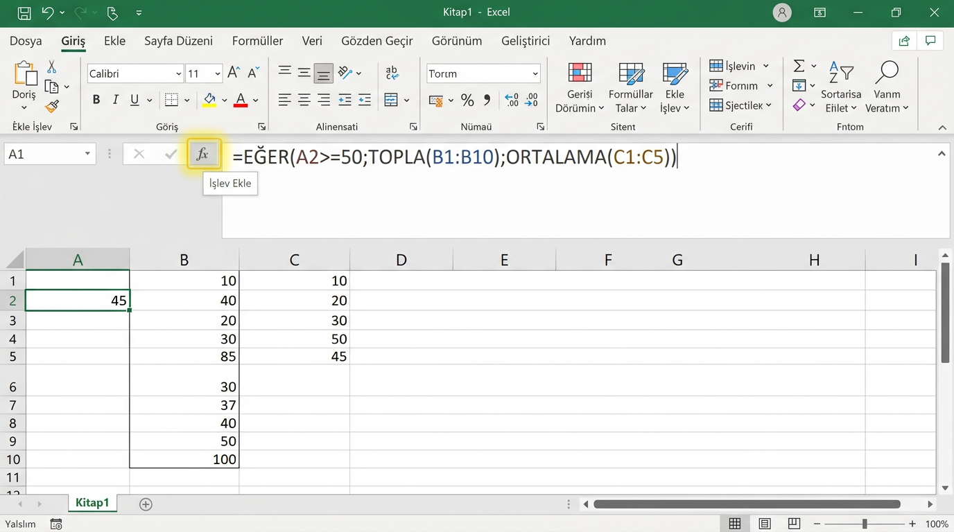 - Ad Tanımla: Bir aralığı seçin → Formüller → Ad Tanımla → İsim verin (örn. "SatisVerisi"). Artık formüllerde =TOPLA(SatisVerisi) yazabilirsiniz.