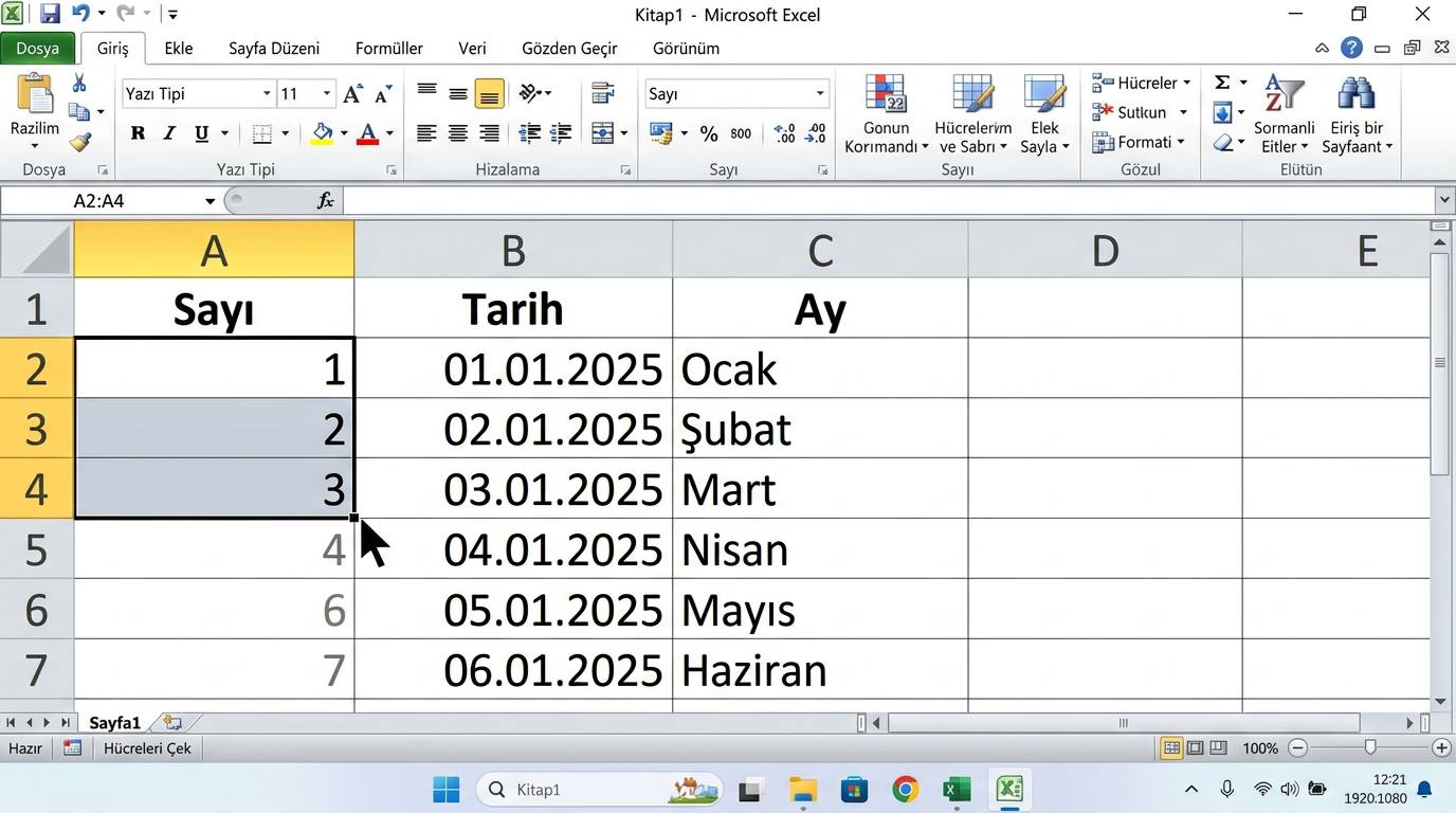 - 💡Giriş sekmesindeki komutların çoğunun klavye kısayolu vardır — kısayolları öğrenmek hızınızı 3-4 kat artırır.