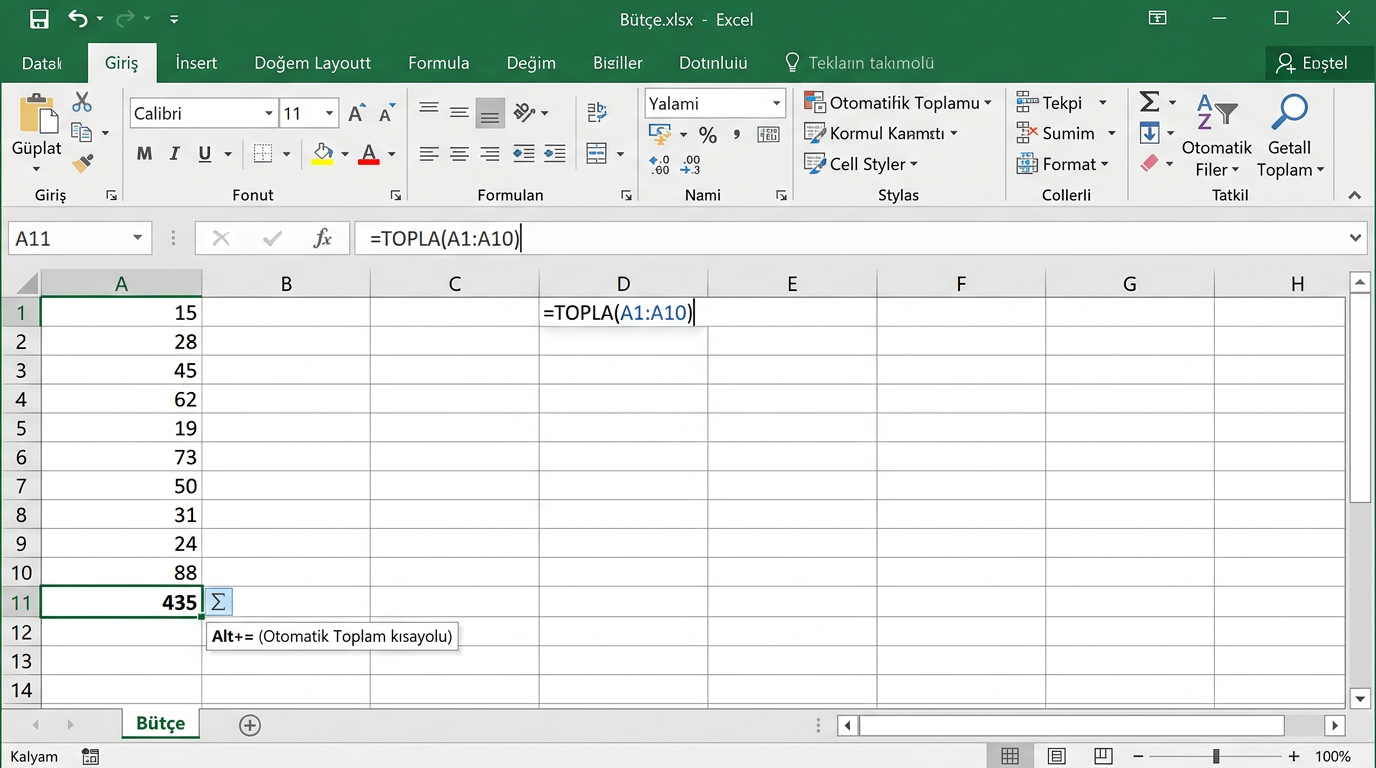 - Düzenleme grubu: Alt+= kısayolu ile TOPLA formülü otomatik yazılır. Bul ve Değiştir (Ctrl+H), Sırala ve Filtrele seçenekleri buradadır.
