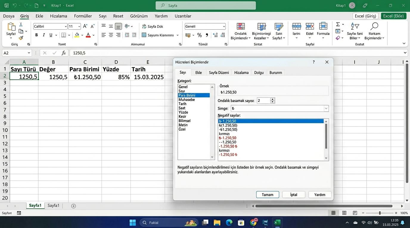 - Sayı grubu: Açılır listeden Genel, Sayı, Para Birimi, Tarih vb. format seçin. "%" butonu yüzde formatı uygular; "," butonu binlik ayırıcı ekler.