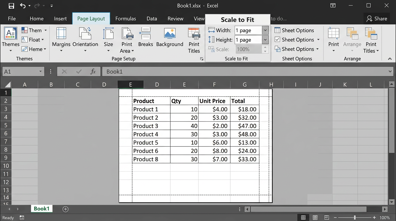 - Ölçekleme: Genişlik ve Yükseklik açılır listelerinden "1 sayfa" seçerek tüm sütunların tek sayfaya sığmasını sağlayabilirsiniz.